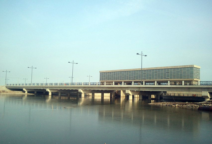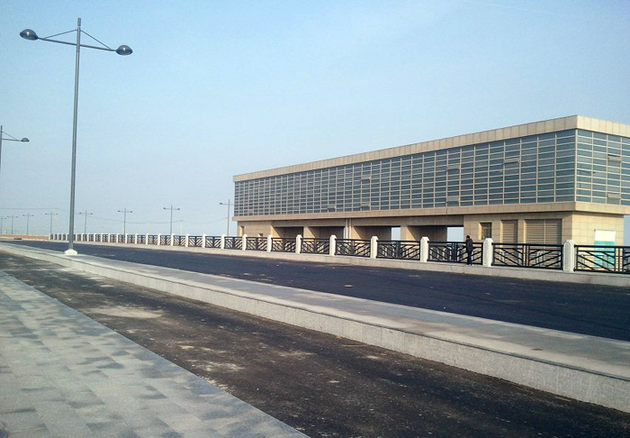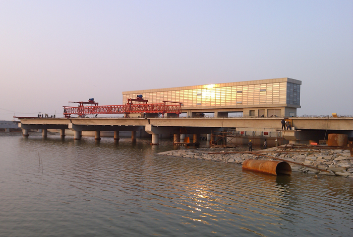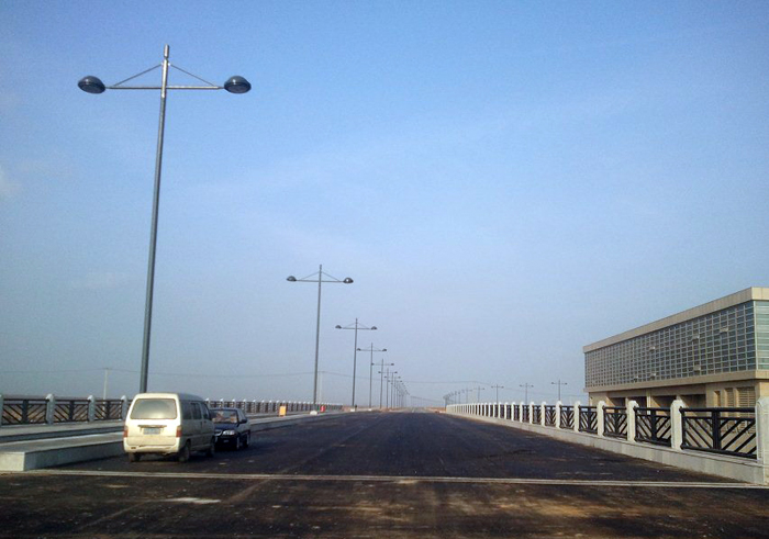 10月5日,架桥机进驻工地现场架设箱梁。箱梁分边跨边梁、边跨中梁、中跨边梁、中跨中梁4种规格,单片箱梁最大重量达100吨。10月12日,第一片箱梁顺利就位。至11月20日,54片箱梁全部架设完成。项目部技术人员及时进行质量、安全技术跟踪,严把质量关、安全关,扎实做好各项工作,确保架桥施工质量和安全得到有效控制。22日,桥面沥青混凝土摊铺结束。27日,人行道板、大理石装饰及路缘栏杆安装结束,一座雄伟的大桥展现在人们眼前。