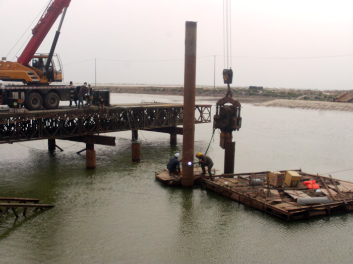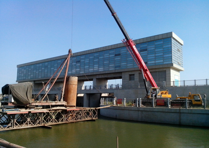 而全桥36根40多米深的钻孔灌注桩施工因其地质复杂多变、未知因素多,成为施工第一难点和焦点,尤其是地处河道深水区的12个桥墩的灌注桩施工更是异常艰难。同时新城闸还是连云新城地区唯一能在汛期发挥城市防汛排涝的水闸,汛期必须保证正常运行。项目部根据施工现场地质条件,经过多个方案比选,最终采用了搭建水上平台施工方案,在河道上搭设钢便桥进行钻孔,保证新城闸在汛期也能正常运行。由于地质条件复杂多变,再加上特殊的施工环境造成的护筒内外的特殊压力差,因此,必须抓好施工过程控制,及时处理特殊事件,以确保工程顺利进行。当进行到最后一个桥墩灌注桩作业时,成孔作业在水下30多米深发生了塌孔现象,锤头被埋在下面。尽管项目部想尽了办法,也没能捞出锤头。但时间不等人,项目部当机立断,放弃锤头打捞,重新购置了一只价值6万多的锤头继续作业。9月17日,完成了全部灌注桩施工任务,为开展交通桥主体施工扫除了第一道障碍,也为我公司在沼泽、淤泥湿地中钻孔成桩积累了经验。