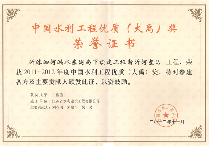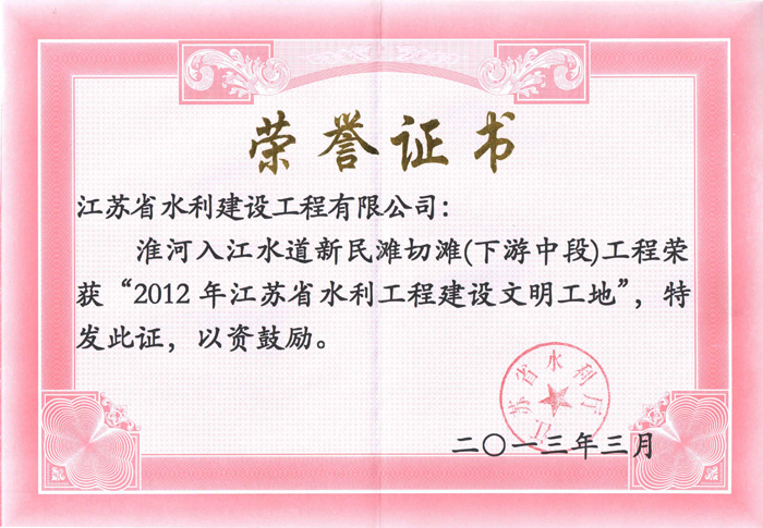 公司连续多年被评为全国水利建设先进集体、全国优秀水利企业、全国安全生产和质量管理先进单位、江苏省文明单位、建筑业百强企业,荣获江苏省“五一劳动奖章”。