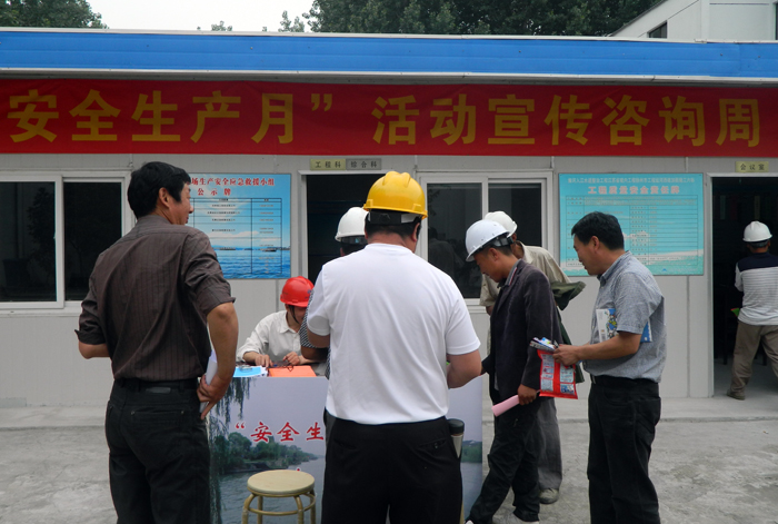 项目部在现场设置了宣传咨询服务台,就安全生产法律法规、施工安全、用电安全进行现场咨询,耐心解答员工提出的有关问题,并向员工发放了“安全生产八字警句”等宣传资料。一线员工还积极参加了安全生产知识猜谜活动。