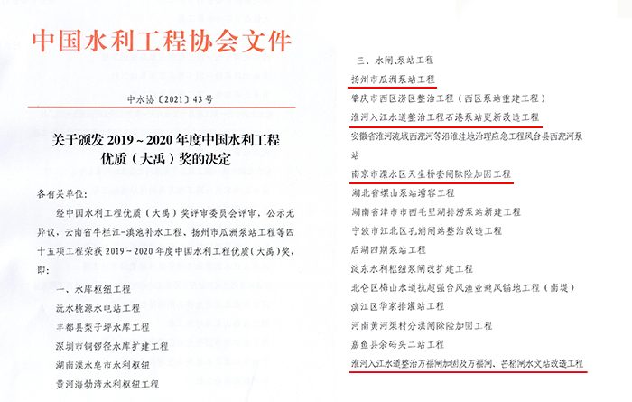 近日,20192020年度中国水利工程优质(大禹)奖评选结果揭晓,公司承建的扬州市瓜洲泵站工程、淮河入江水道整治工程石港泵站更新改造工程、淮河入江水道整治万福闸加固及万福闸、芒稻闸水文站改造工程三项工程获奖;水机公司参建的淮河入江水道整治工程石港泵站更新改造工程、南京市溧水区天生桥套闸除险加固工程、淮河入江水道整治万福闸加固及万福闸、芒稻闸水文站改造工程三项工程获奖。