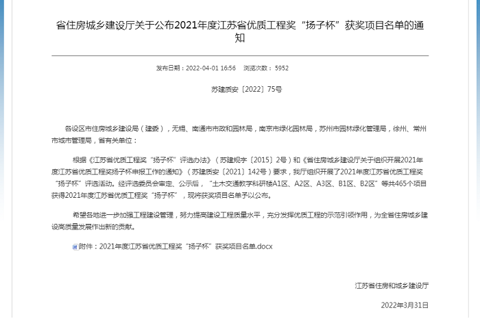公司三项工程荣获2021年度江苏省优质工程奖“扬子杯”