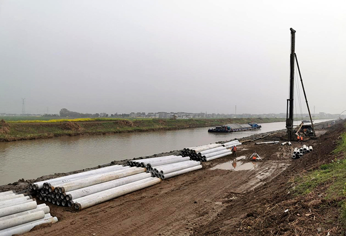 溧阳市北河治理工程施工七标主要工作内容有挡墙、穿堤建筑物(电灌站、涵洞)、老护岸加固等。截止目前,已完成顺河围堰2300m,陆上土方开挖约3m³,土方回填1m³,钢筋混凝土挡墙施工1247m,地基处理预制管桩施打2340根。
