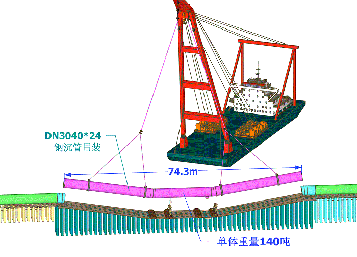 该工程主要施工内容为大口径钢管敷设,钢管规格DN3040*24mm,敷设总长度650米,其中穿越七乡河埋管设计采用沉管法工艺,钢沉管水平总长度达到80.797m,且两端不对称,不利于吊装作业。为避免沉管水下作业时存在的诸多不确定因素,项目部提出沉管端部弯头及以外的管道暂不焊接,后续施工时完全有条件干作业焊接。经设计认可优化后的轴线总长度75m,水平投影长度74.3m,净重量140吨。