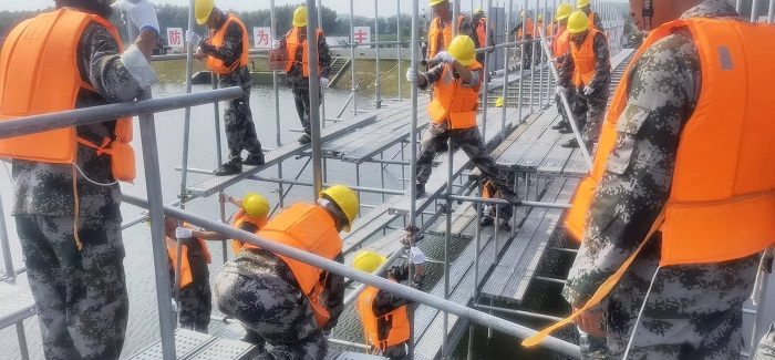6月20日,公司参加全省军地联合防汛应急抢险救援培训演练队员们顶着炎炎烈日投入训练,他们挥汗如雨,在省防汛抢险训练场(南京市六合区红山窑水利枢纽)严格按照演练要求进行钢木组合土石坝钢木框架的搭、拆培训。