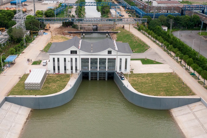 洋思港闸站采用闸站结合形式,设计引水流量为5m3/s,排涝流量为10m3/s。 闸站共4孔,单孔净宽3m,采用潜水轴流泵4台套,单机设计流量2.5m3/s,闸站中间2孔为双向水泵,其余2孔为单向排涝水泵,总装机功率为 880kW。工程完工后,能进一步提高沿江区域内水环境质量。