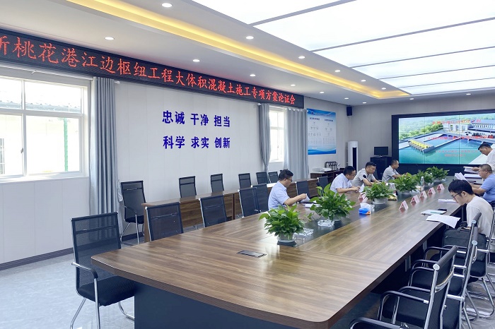 此次浇筑为新桃花港江边枢纽首次大体积混凝土浇筑,克服了气温高、方量大等难点。为保证浇筑工作顺利完成,工程参建各方对首块底板的止水、钢筋、模板及浇筑准备等各项内容进行了联合检查和验收,确保各项条件均符合施工要求。浇筑前,项目部组织召开大体积混凝土底板施工专项方案专家评审会,分析底板浇筑技术难点,为浇筑施工提供了有力的技术指导;组织召开底板浇筑准备工作落实会议,合理安排任务,科学调配各项资源,确保做好浇筑前的各项准备工作;召开了技术、安全交底会议,对技术人员和作业人员进行技术和安全交底,严格按照方案部署浇筑任务。