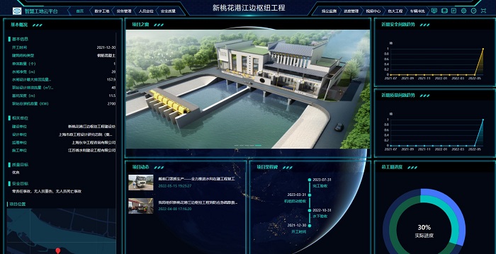 新桃花港江边枢纽工程利用互联网+技术打造的智慧工地平台,通过云计算、大数据、移动互联网及人工智能等前沿科技,实现了视频监控、劳务实名制管理、人员安全帽定位、扬尘噪音监控、危大工程监测、车辆冲洗监测等诸多智慧功能,提升了工地智能化管理水平。