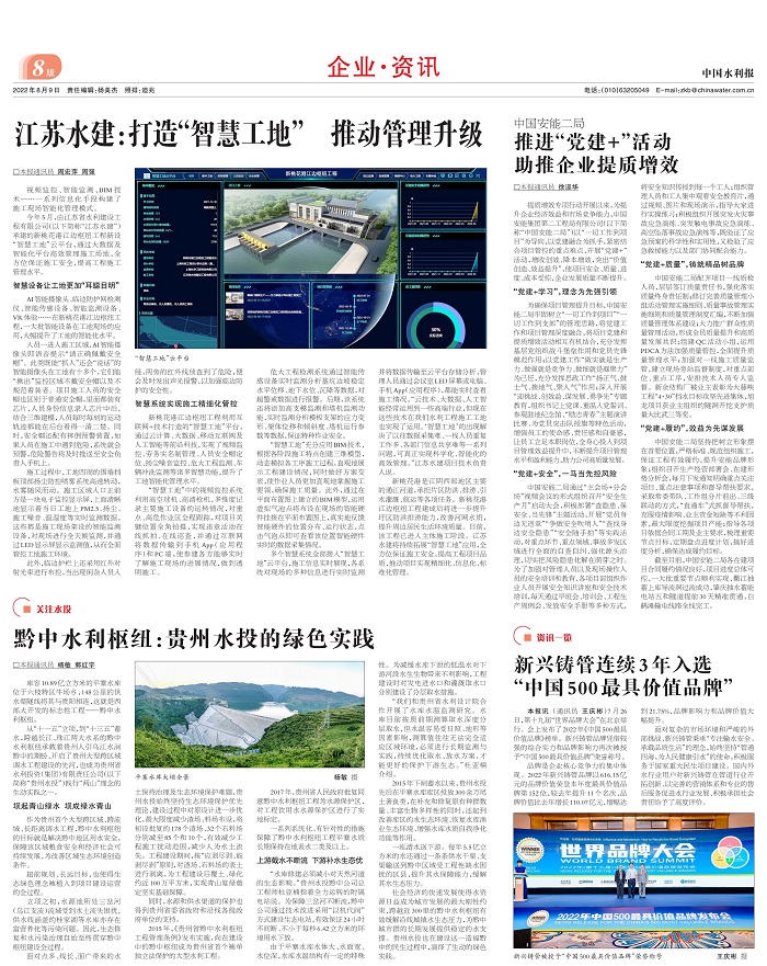 89日,《中国水利报》8版刊发《江苏水建:打造“智慧工地” 推动管理升级》文章,宣传报道公司新桃花港“智慧工地”建设。