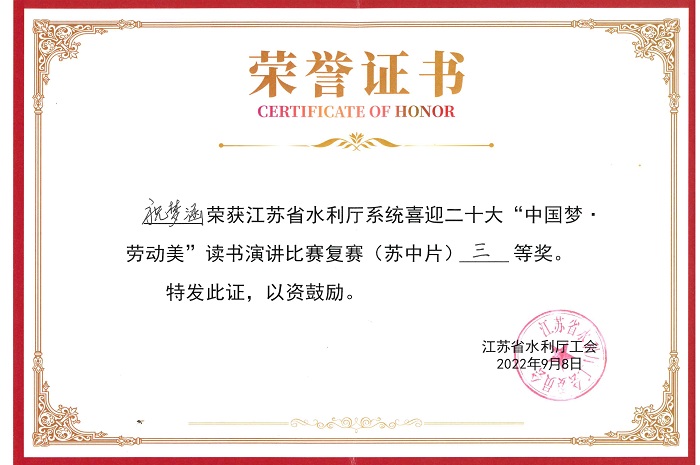近日,厅工会“中国梦、劳动美”读书演讲比赛苏中片区复赛在扬州举行,公司职工祝梦涵获得三等奖。