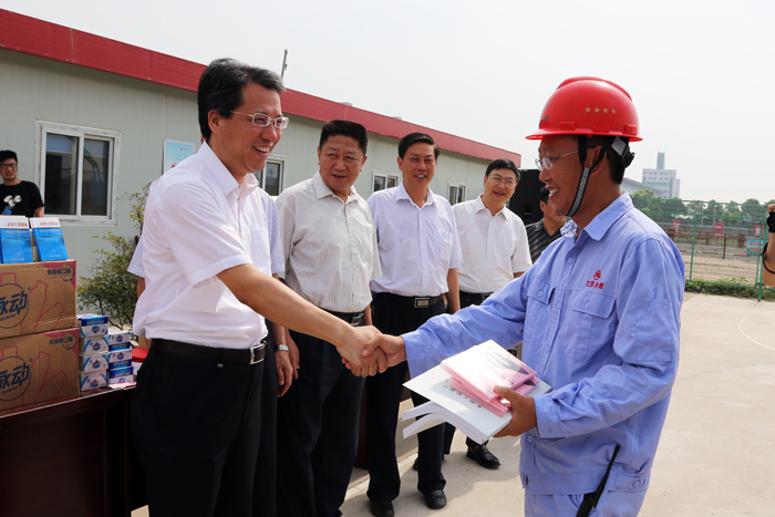 韩全林一行深入一线工地,亲切看望和慰问了工地建设者,将矿泉水、毛巾、防暑降温用品和《劳动保护手册》、安全宣传教育光盘等慰问品送到建设管理者手中,他还详细询问了他们的生产、生活情况,并勉励大家要鼓足干劲,争取又快又好地完成引江河二期工程建设任务。