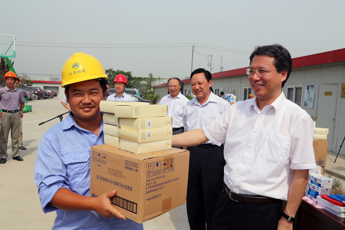 725上午,省水利厅党组成员、人事处处长韩全林率队来我公司引江河二期工程建设现场,开展夏季送清凉、送安全、送法律活动。厅机关党委副书记汤超、厅工会主席张晓迅、省水利工程建设局副局长唐世国、省泰州引江河管理处主任张加雪、省泰州引江河二期工程建设局局长马志华等领导陪同慰问,我公司党委副书记、工会主席姜启生、副总经理、引江河二线船闸工程项目经理顾明如、引江河二期工程河道工程施工Ⅰ标项目经理葛年平带领项目部员工接受慰问。