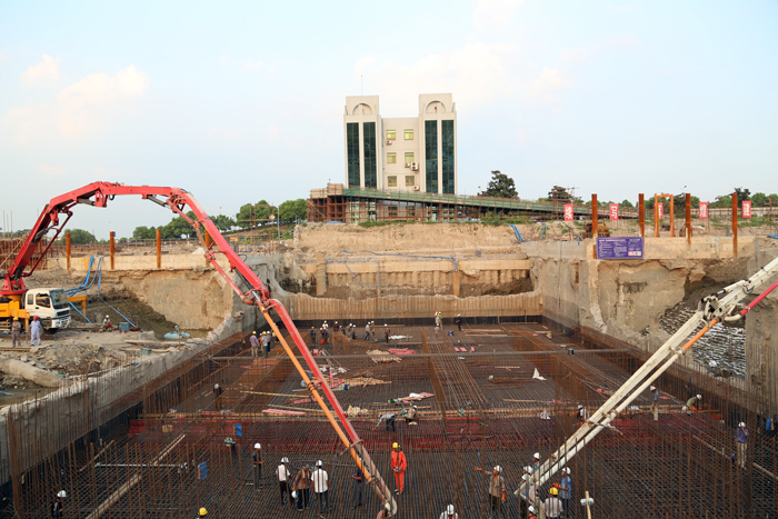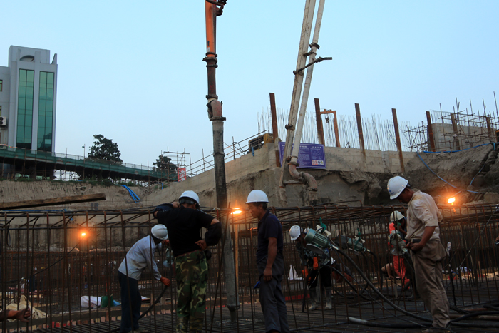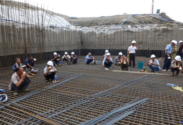 上午10时许,引江河二线船闸工地一片繁忙景象。730日下午618开始的上闸首底板第一块部位的浇筑正在紧张进行中。朱学林董事长和正在工地指导工作的引江河二期工程建设局局长马志华,在公司副总经理、项目经理顾明如的陪同下,来到浇筑现场,仔细检查了解工程施工情况。他对项目部战高温、斗酷暑,抓紧一切有利时机实施上闸首底板钢筋工程、模板工程施工,具备条件后迅速组织底板混凝土浇筑表示满意。他叮嘱在场的管理人员,一要强化高温条件下浇筑混凝土的质量控制,各项温控措施和养护措施一定要落实到位,高效工作更要确保优良质量;二要密切关注现场作业人员的身体状况,提高现场防暑降温标准,落实有效措施为工人们创造良好的饮食和休息条件。顾明如介绍了上闸首基坑封底后开展底板施工情况。在项目部员工的艰苦努力下,通过合理调度、周密安排和有序组织,提前具备了底板浇筑条件,并力争85日前完成上闸首底板的浇筑。在落实防暑降温措施方面,项目部加大了措施投入,开放了工地会议室供工友们午休和晚上休息,并安排安全员,督促每一个进场作业人员服用防暑药品;每天下午提供包子点心补充体力,将人文关怀落到实处。