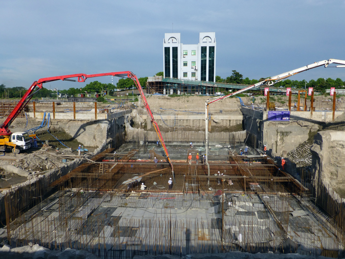 上闸首底板位于泰州引江河二线船闸的上游,左侧是一线船闸上闸首,一、二线船闸纵向中心线距离仅70m;底板底高层▽-8.1。按照施工工艺是在上闸首采用围封地连墙进行基坑支护,基坑开挖后进行底板施工。715,基坑开挖到位并封底。为减少基坑暴露对一线船闸的影响,全体施工人员顶焦阳、冒酷暑,日夜奋战。722完成了基坑内所有桩头凿除、止水安装等底板施工前准备工作,730300多吨底板钢筋绑扎完成。混凝土大浇筑于730日下午6时开仓,分左中右三块穿插进行。至82日上午9时,已完成左右两块,共浇筑混凝土约2800方。目前中间部位的底板正在浇筑中。