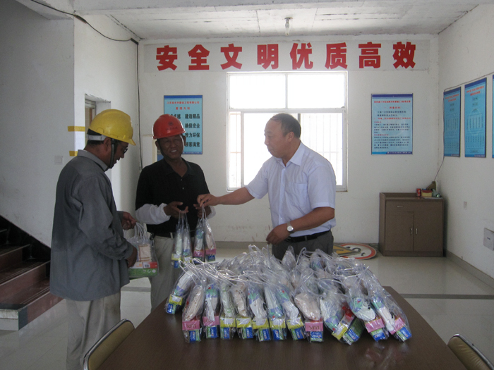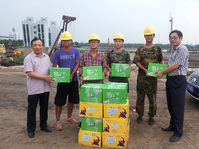 今年入夏以来,持续高温天气突破历史纪录。基础工程分公司的广大一线员工,顶烈日、斗酷暑,坚守在泰州卤汀河、引江河二期工程等工地,不畏劳苦,辛勤奉献。8月份,公司工会姜启生主席和基础分公司李桂明经理、王志元书记等领导分别到工地慰问,给一线员工送来防暑降温用品,叮嘱项目部落实防暑防温措施,确保安全生产和员工身体健康。