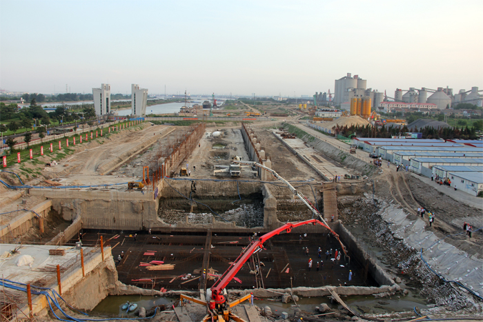 2013730618分,肆虐一天的骄阳依然烧烤着大地。泰州引江河二期工程二线船闸上闸首基坑南北两侧的混凝土汽车泵伸出长长的臂膀,将第一仓混凝土注入底板密集的钢筋之中。经过54个小时的奋战,二线船闸上闸首底板顺利浇筑完成。一个月来,公司引江河二线船闸项目部的广大员工,较量高温考验,落实技术措施,开展技术攻关,啃下了船闸施工的第一块“硬骨头”,为扎实推进泰州引江河二期工程建设迈出了坚实的一步。