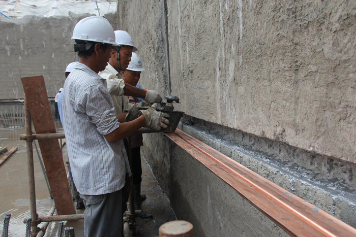 基坑底部采用地连墙悬臂支护,底板与地连墙之间需安装170长的止水。在地连墙上凿槽安装铜片止水的形式在以往的水利工程施工中尚未遇到过,没有经验可循。项目部经过认真分析,提出了三种基本可行方案并与设计院多次沟通,最终设计院确认选择“嵌入式”施工方案,并指出这种方案只能在省水建承建的项目上进行试验和检验。项目部邀请了材试室的专家进行了现场指导。施工时,按照开槽、找平、粘贴、嵌入、填充、封闭等操作流程一气呵成,将止水铜片服帖、严密地安装在地连墙上。其后设计院进行了现场验收,一致认可了现场安装工艺,并表示该工艺将为今后类似工程的设计、施工提供了经验借鉴。