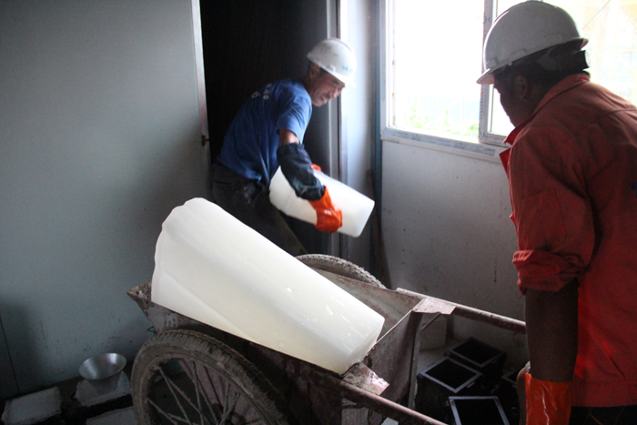 如果说一个个技术难题考验的是建设者们的智慧和能力,而7月流火罕见的高温则考验着他们的意志和斗志。710号以来,温度持续在35以上,基坑内更高达40以上。面对近15的深基坑、4.5高的悬臂挡土,面对近在咫尺、日夜通航的一线船闸,面对无法预控、随时可能到来的台风暴雨,施工进度来不得半点的迟疑和停歇。160根桩头、400吨钢筋、4000方砼,无一不需在高温酷暑的烈日下完成。木工打桩头、水石工扎钢筋,现场进行多工种的轮换和跨工种交叉作业,上半夜扎钢筋,下半夜搭脚手,在项目部的精心组织下,一切都有条不紊的进行着,提前具备了上闸首底板浇筑条件。730开始,在37高温条件下,开仓浇筑底板混凝土。54个小时浇筑完成4000方混凝土,这在以往的施工中也是十分罕见的。为确保浇筑质量,项目部采取了一系列高温条件下浇筑混凝土质量控制措施,采用了原材料遮阳、拌合用水加冰、粗骨料预冷、水平分层浇筑等一系列降温措施,降低混凝土的入仓温度,达到了预期的效果。