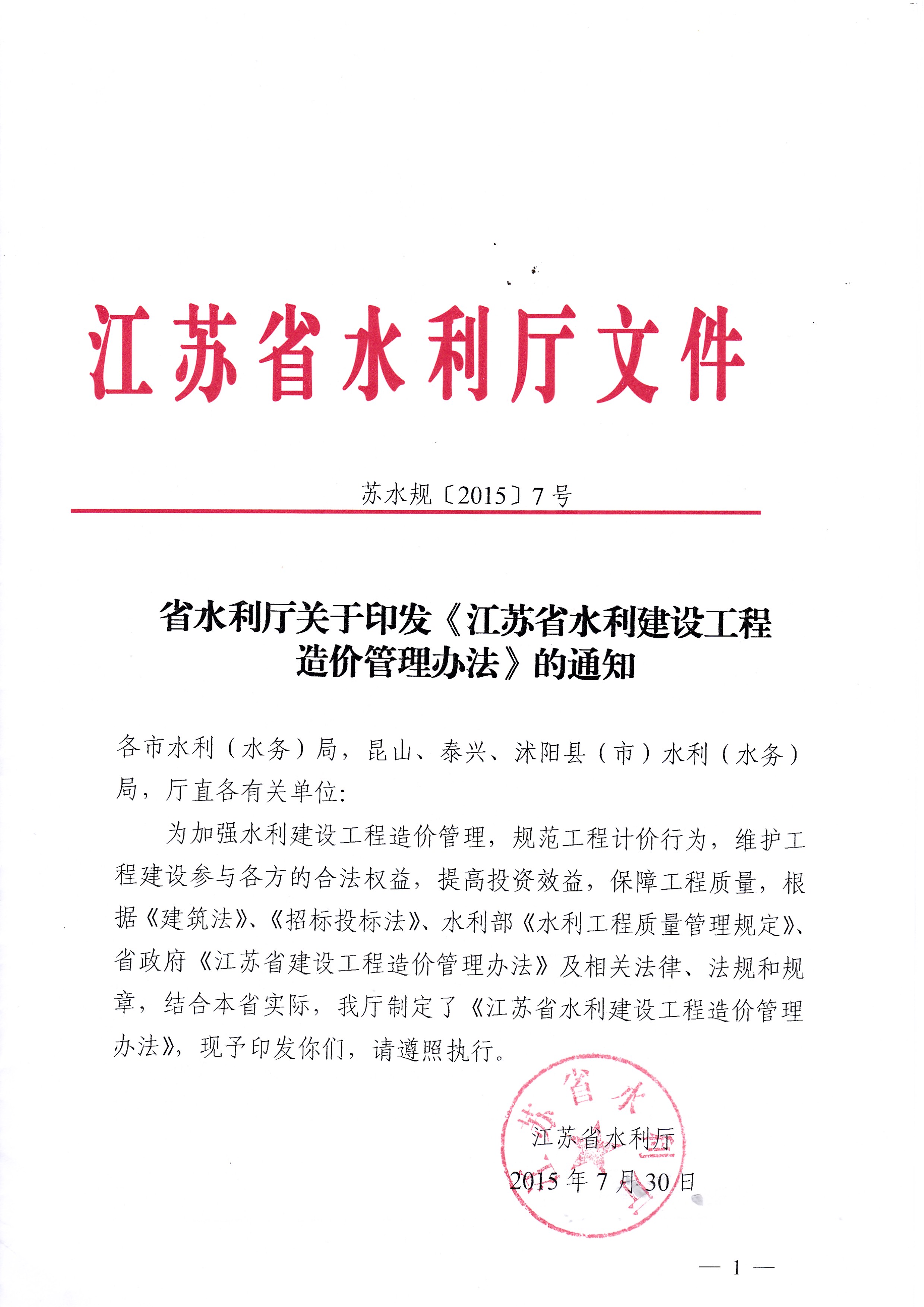 省水利厅关于印发《江苏省水利建设工程造价管理办法》的通知
