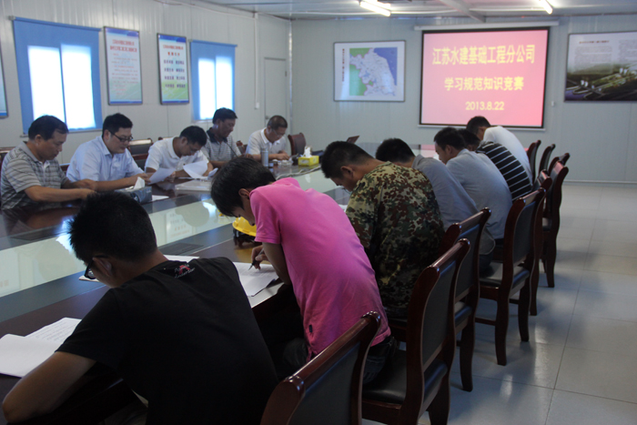为响应省水利厅关于《加强质量强水建设的指导意见》的通知精神,迎接公司开展2013年“质量月”活动,达到全员自觉参与质量管理、提高工程质量管理水平的目的,基础工程分公司58月份组织开展了“学习规范”知识竞赛活动。根据工程分散、人员不能相对集中的情况,基础工程分公司通过发动宣传、组织学习、分片考试等形式,组织人员学习质量管理知识,检验学习教育成效。目前,活动第一季——《建筑桩基技术规范》(JGJ94-2008)知识竞赛于830顺利结束。