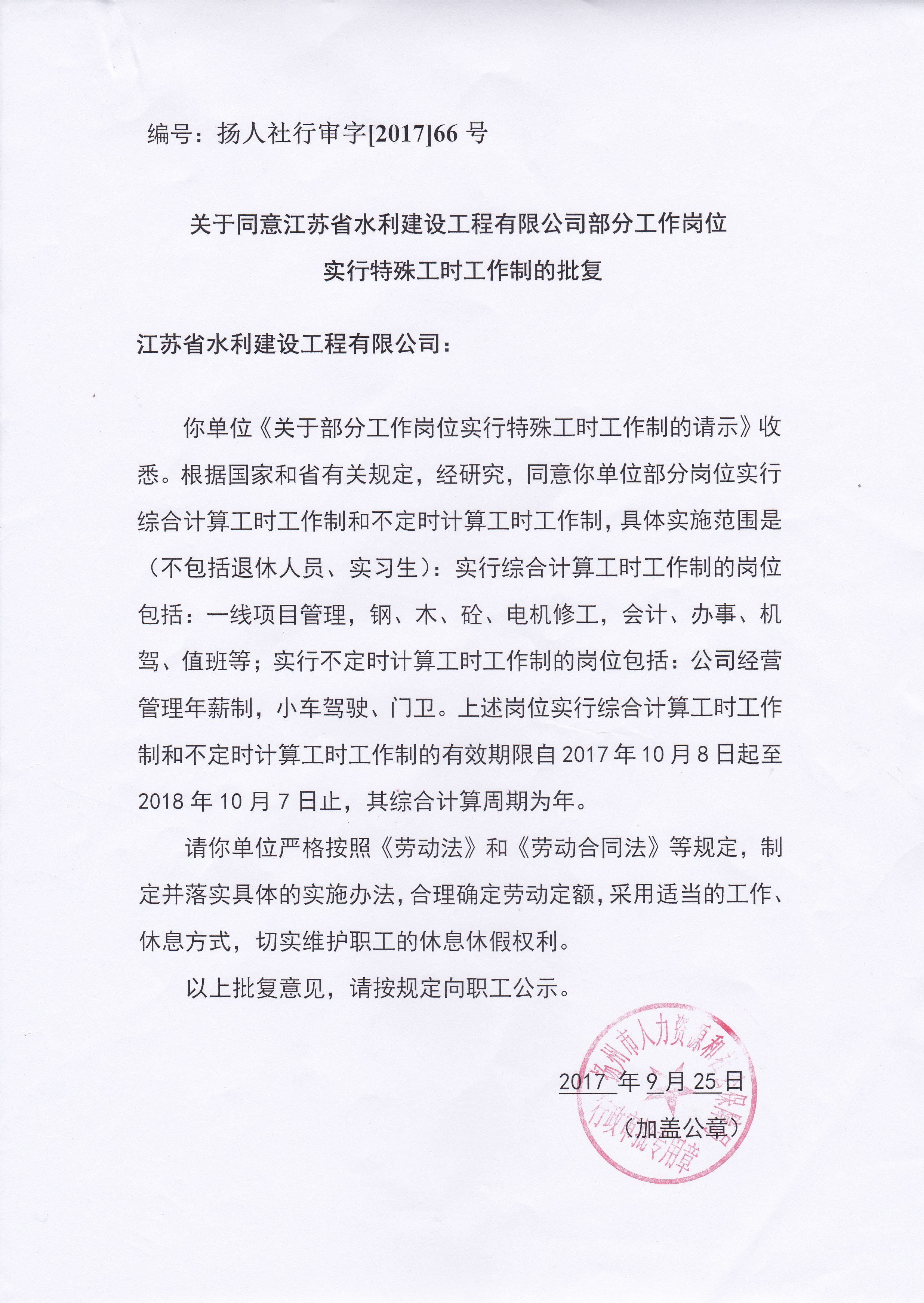 关于同意球友会在线官网部分工作岗位实行特殊工时工作制的批复