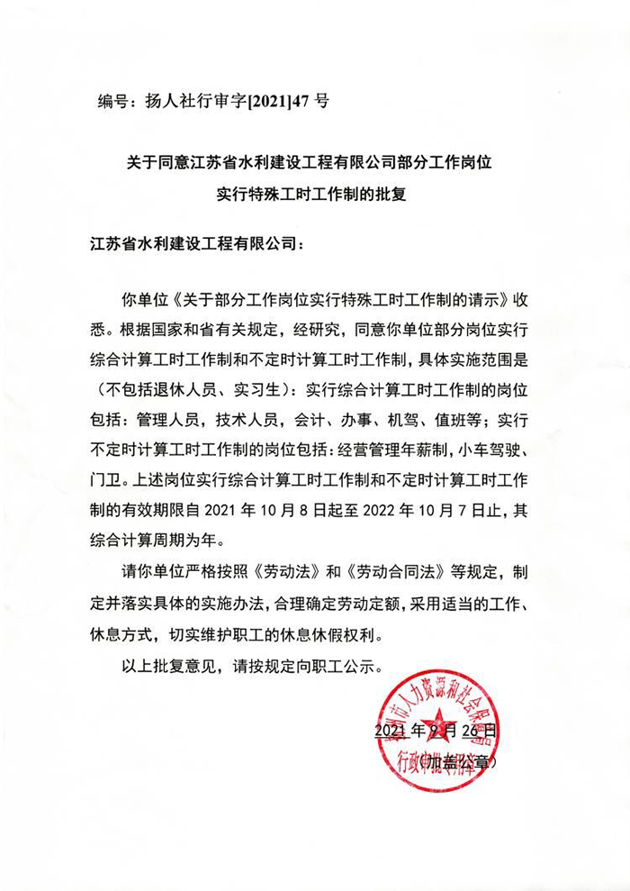 关于同意球友会在线官网部分工作岗位实行特殊工时工作制的批复
