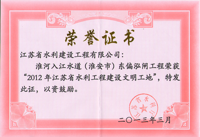 淮河入江水道东偏泓闸工程被评为“江苏省水利工程建设文明工地”