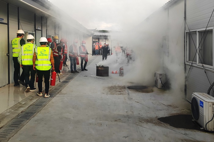 火灾应急演练模拟项目部员工宿舍发生火灾,项目部消防队在总指挥的统筹指挥下开展救援,应急疏散组紧急疏散生活区职工并将伤者搀扶到安全地带,医疗组对伤员进行简单处理后运送至医院接受进一步治疗,灭火抢险组使用灭火器灭火。经过大家的通力合作,火情迅速得到控制,受伤人员也得到了有效的医疗救治,演练取得圆满成功。随后,项目部组织人员在安全地带轮流使用灭火器扑灭明火,增强施工人员使用灭火器的能力。