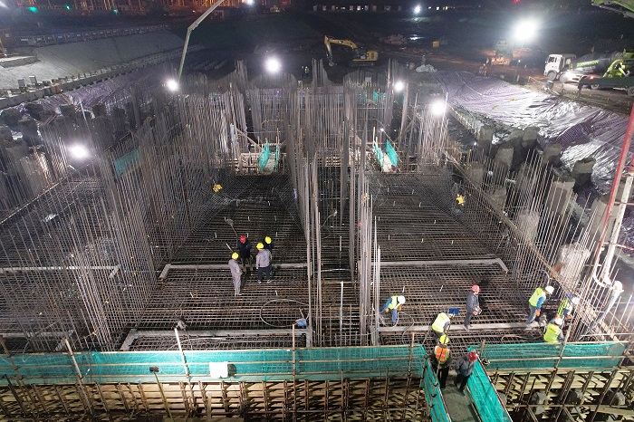 本次浇筑底板长38米、宽27.78米、高1.55-1.8米,钢筋制作安装总量约240吨,混凝土浇筑总方量2257方。