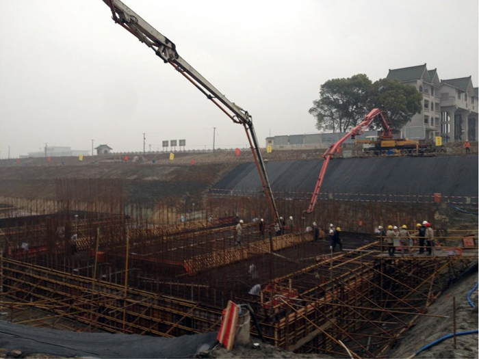 3月18日,设备租赁分公司接到新沟河江边枢纽项目部的通知,拟于26日、29日开仓浇筑船闸上、下闸首两块底板。根据业主提出的白天进行混凝土收面作业的要求,浇筑时间必须控制在20小时以内。按照这一方案,施工现场配备的一台40M泵车、4辆罐车尚不能满足浇筑需要。而解决这一问题有两个渠道,一是与公司内部其他项目部沟通,调运设备增援江边枢纽;另一个就是加大资金投入外租设备。为了节约租赁费用,设备租赁分公司及时将江边枢纽的施工情况向引江河二线船闸项目部作了联系沟通。引江河二线船闸项目部在关键时刻彰显大局意识,立即调整了自己的生产计划,调出46M泵车、3辆罐车,由项目组长亲自带队,驰援江边枢纽。