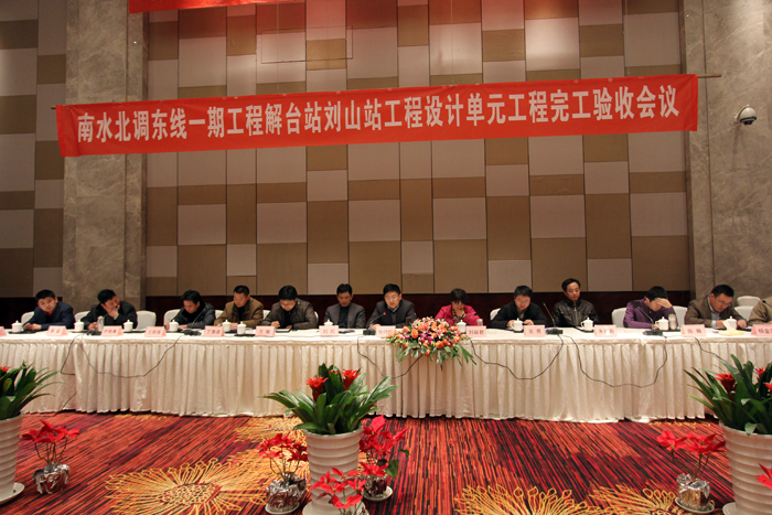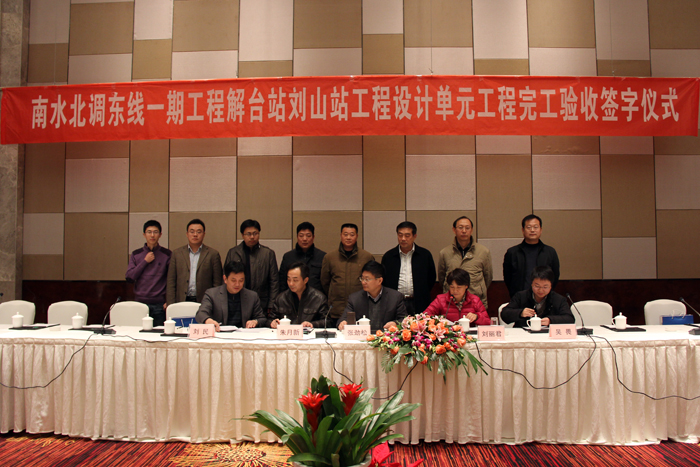 20121218~19日,江苏省南水北调办公室受国务院南水北调办公室委托在徐州市组织了南水北调东线一期工程解台站刘山站工程设计单元工程完工验收,我公司承建的解台站设计单元工程顺利通过完工验收。省南办张劲松副主任、刘丽君处长、省水源公司副总经理刘军及国调办、淮委、省水利厅、省水源公司、质量监督、建设、设计、施工等单位领导专家出席会议,公司副总经理许国安参加了验收活动。