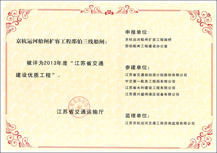 本站讯,近日,由我公司参建的京杭运河扩容工程邵伯三线船闸工程被江苏省交通运输厅评为“2013年度江苏省交通建设优质工程”。