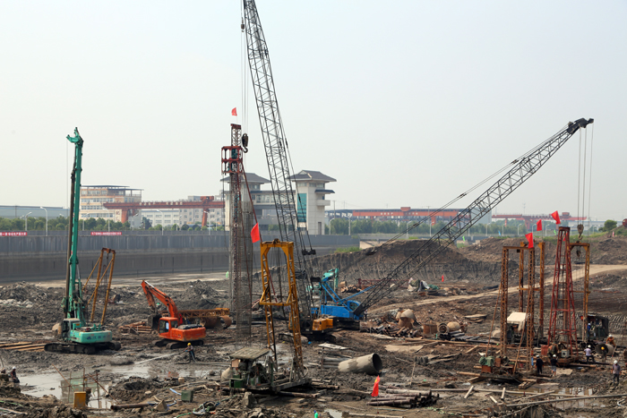 84,公司在七浦塘拓浚整治工程江边枢纽泵站工程项目部召开了安全生产及工期推进会。公司董事长夏国春、总经理时爱祥、副总经理杨斌、工程部、基础分公司、机电安装分公司、水机有限公司负责同志参加了会议。公司总经理时爱祥主持会议,项目部陈兴奎汇报了工程进展情况及面临的困难。大家就围绕如何加快基础施工进度,保证820实现泵站第一块底板具备浇筑条件展开了讨论。基础分公司经理李桂明表态,在现有两台旋挖机、一台履带吊、一台汽车吊的基础上,再增加一台履带吊,回旋钻桩机增加到9台。同时增加管理人员和作业工人,合理调度、组织各机械协同作业,确保每天能够完成8根灌注桩,全力以赴完成桩基施工任务。项目经理杨斌表示,将带领项目部员工发扬能打硬仗、能啃硬骨头的精神,增加钢筋作业人员,增加人力、物力投入,加快钢筋笼制作速度,确保实现第一块底板浇筑的节点目标。