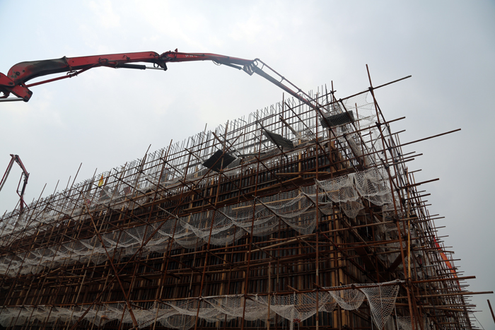 继第一节沉井实施完成后,项目部立即进入了紧张的第二节制作施工。项目部精心组织,科学管理,带领全体员工顶住烈日和暴风雨的考验,迅速开展第二节沉井脚手架、模板和钢筋作业,确保如期具备大浇筑条件。