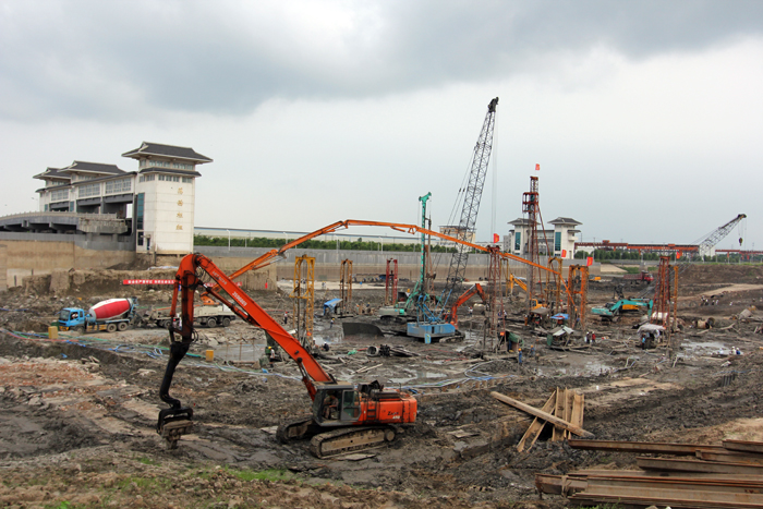 没有热情洋溢的动员,也没有信誓旦旦的表态,项目部全体员工立即行动起来。他们倒排工期,一个节点一个节点的去攻克。第一个节点目标是在9月初完成泵站1#站身底板施工。围绕这个节点,项目部要迅速完成2000多米钢板桩支护、7000多方灌注桩、4000多米搅拌桩的施工。桩基施工完成后,还有5米多深的基坑开挖、破桩头、封底、桩基检测、立模、扎筋、埋件等一系列工作。工作量大,各工种交叉作业多,现场协调任务重。而更为困难的是,8月份遇到了罕见的“夏梅”,一个月有22天在下雨,连绵的阴雨使冲刺第一节点目标的抢工变得异常艰难。