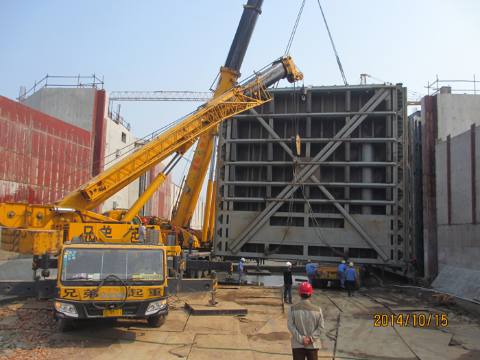 进入10月份以来,省水机公司高良涧船闸项目部经过十多天的准备,制订了吊装作业方案,修整了进场道路,整体铺设了100多吨钢板,确保了大型平板车安全平稳转运闸门。15日上午1030分,采用400t130t汽车吊配合作业,顺利将上闸首2扇闸门吊装就位。上闸首闸门完成吊装后,经过进一步加固调试后,将形成新的防洪体系。待水利等部门检查验收后,即可进行下闸首施工,为加快建成高良涧船闸扩容工程,实现通航目标打下了坚实的基础。