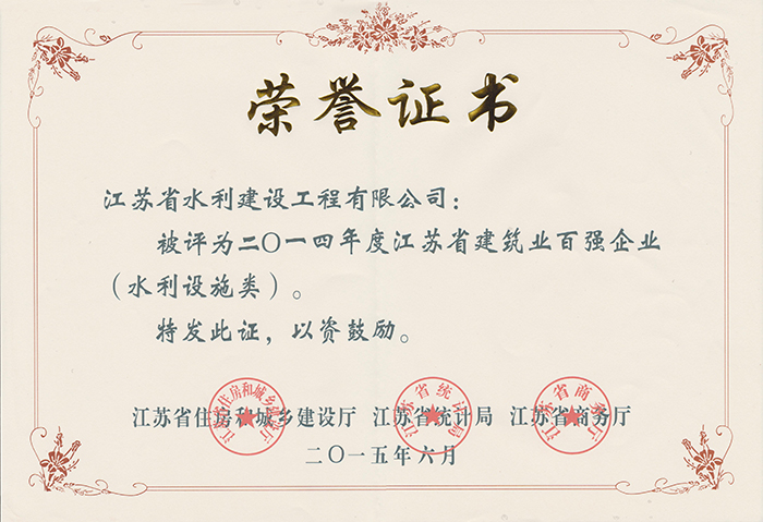 “百强企业”认定工作由江苏省住房和城乡建设厅、江苏省统计局、江苏省商务厅联合成立认定委员会,本着“尊重事实、严格标准、规范程序、公平公正”的原则,评选出综合实力类、建筑装饰装修类、建筑钢结构类、建筑安装类、基础设施类、建筑外经类六个大类共100家企业,有较强的权威性和代表性。公司是省内唯一一家被认定为“百强企业”专业实力类的水利基础设施施工企业。