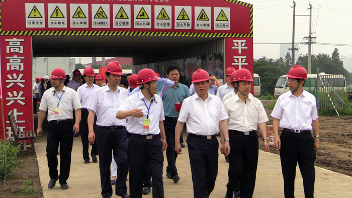 走进由我公司承建的新沟河江边枢纽施工现场,一派繁忙景象。李云峰听取了新沟河工程规划布置、征地拆迁、工程建设等情况汇报,沿着施工便道,逐一察看正在建设中的节制闸、泵站工地,并仔细询问施工组织和质量保证等情况。