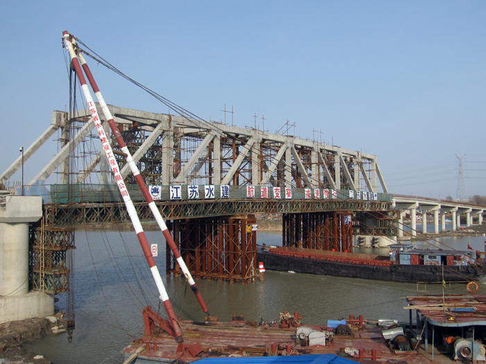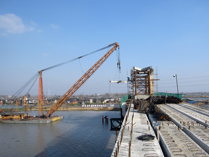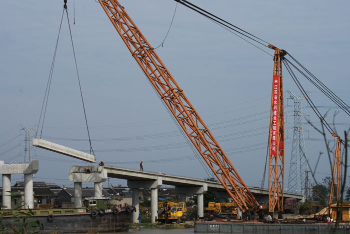 南水北调泰州卤汀河董潭生产桥主桥吊装完成