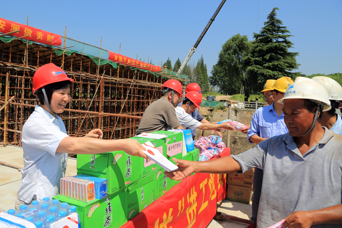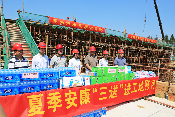 730上午,省水利厅工会主席张晓迅、省水利工程建设局副局长唐世国及相关处室负责同志组成慰问组,来到我公司扬州闸加固工程工地,开展夏季安康“送清凉、送安全、送法律”慰问活动,亲切慰问高温期间坚守岗位的工程建设者,公司董事长夏国春参加了慰问活动。