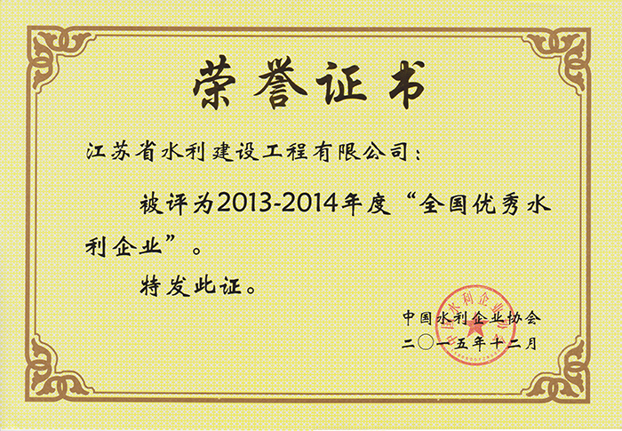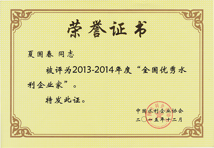12月18日,中国水利企业协会在湖北省武汉市召开了第五届理事会第五次会议,表彰了2013-2014年度全国优秀水利企业、优秀水利企业家。公司被授予“全国优秀水利企业”荣誉称号,夏国春董事长被授予“全国优秀水利企业家”荣誉称号。公司董事长夏国春、总经理时爱祥出席了表彰大会。