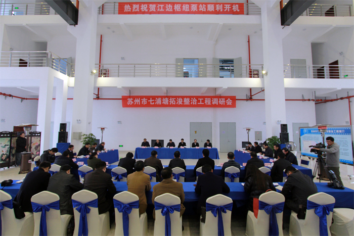 1月14日,苏州市委书记周乃翔,市委副书记、代市长曲福田率队专题调研七浦塘拓浚整治工程,在我公司刚刚建成的江边枢纽泵房内召开调研会,并启动江边枢纽开泵引水。我公司董事长夏国春汇报了工程建设情况。副总经理杨斌参加调研。