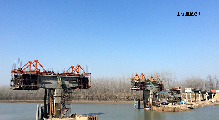 刘河桥是一座主跨(40m+60m+40 m)采用水上挂篮施工的三跨连续箱梁结构桥梁,全桥长428m,西侧引桥为19跨×10m钢筋混凝土预制空心板梁,主桥与西侧引桥之间设置8m长变截面现浇板梁;东侧引桥为54×20m+10m钢筋混凝土预应力空心板梁。自201588工程开工以来,项目部狠抓现场安全和质量管理,积极采用新技术、新工艺,优化专项施工方案,全力以赴推进工程进展。全桥下部结构及主跨0#1#2#8#块件浇筑已完成,河东引桥板梁已安装完成。目前正重点进行主桥挂篮施工和引桥桥面系施工。