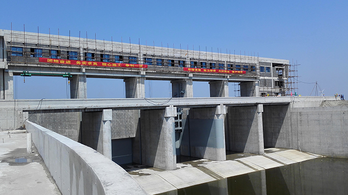 2015年4月12日,我公司项目部进场施工。面对工期紧、工程资金支付条件差、自然条件恶劣等困难,一分公司带领项目部参建员工,优化施工方案,增加资源投入,全力以赴推进工程进展。6月9日,开始地基处理;8月17日浇筑第一块闸室底板;到2016年1月2日水闸主体混凝土施工全部完成,1月20日水下工程全部完成;1月26日通过水下工程验收;5月15日,完成了剩余合同工程。