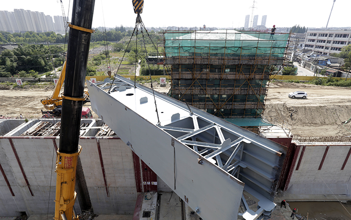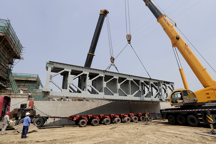 吊装现场,随着指挥哨声的响起,两辆运送闸门的大型平板汽车驶入指定位置,一台500吨和一台200吨的汽车吊紧密配合,闸门起吊、空中转体、侧向移位、斜插门库就位一气呵成,犹如体操运动员精准完美的表演。