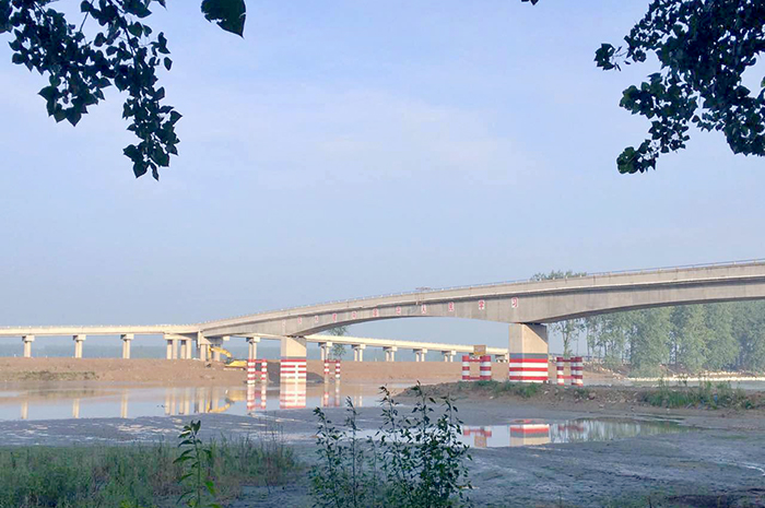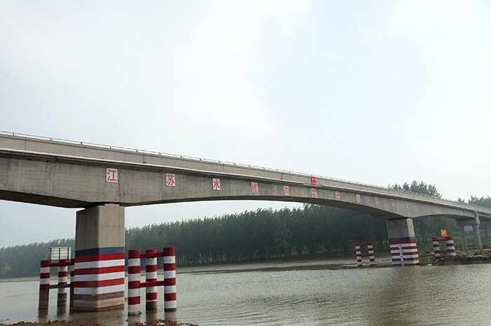 刘河桥桥梁全长428m,桥梁跨径组合为19×10+8+40+60+40+4×20+10m,桥梁主跨为60m三跨现浇连续箱梁结构形式,主桥自东岸过河到西岸后呈“T”字型南北方向展开,设计造型新颖独特。