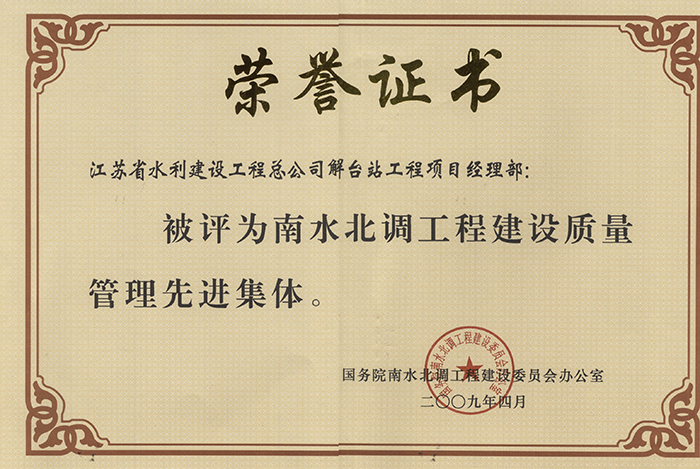 南水北调工程建设质量管理先进集体证书