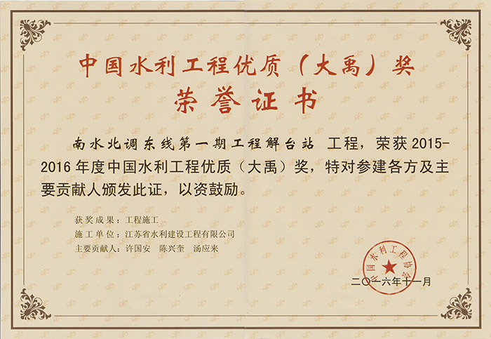 我公司于200410月承建了南水北调东线第一期解台站工程,项目部始终将推进技术创新、确保工程品质放在首位,组织开展了一系列有针对性的新技术、新工艺、新材料、新设备科研课题和施工技术攻关研究,取得了较好的成效。实施的《大型肘形进水流道泵站泵送混凝土防裂方法和应用研究》获得“2008年大禹水利科技技术奖三等奖”,参加安装施工的《低扬程低水头水力机械节能关键技术研究与应用》获得“2013年大禹水利科技技术奖二等奖”, 工程荣获“20152016年度中国水利工程优质(大禹)奖”。
