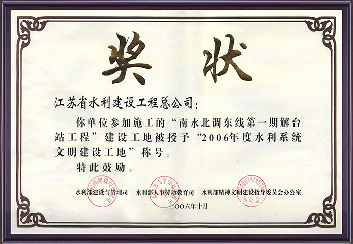 全国水利系统文明建设工地奖状