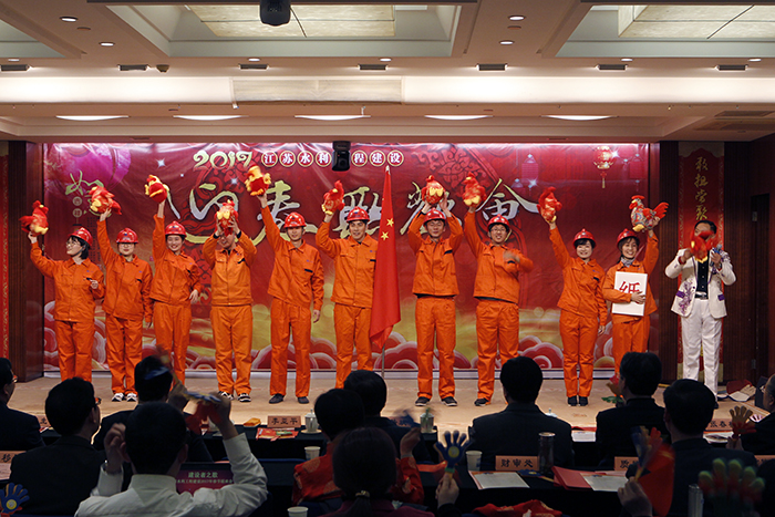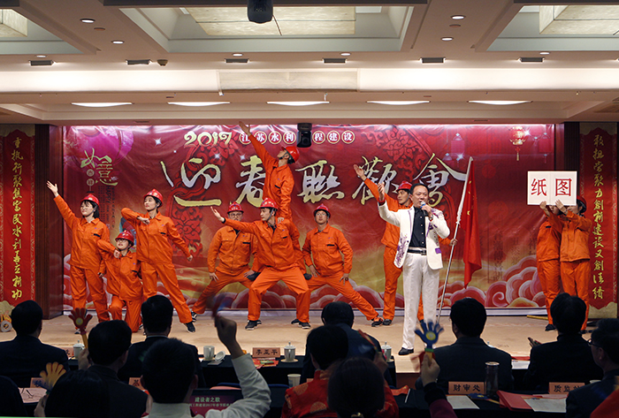 联欢会上,水利建设口干部职工结合工程建设实际,自编自演,融合了舞蹈、歌曲、小品、说唱、歌舞剧、诗歌朗诵等形式多样的文艺节目。我公司的歌舞表演《水利人的信念》呈现了水利施工一线员工日常的工作场景,形式新颖独特,歌声浑厚刚劲,伴舞铿锵有力,获得场下观众的阵阵喝彩。节目完毕后,厅领导还特别为参演人员每人送上一只象征吉祥如意的鸡娃娃,这是对长期战斗在水利施工一线的江苏水建人给予的充分肯定和鼓舞。